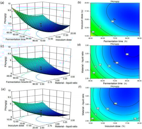 Response-surface plots illustrating the effects on PA content and the interactions between (a) fermentation time and inoculum dose, (c) fermentation time and the material-to-liquid ratio, and (e) inoculum dose and the material-to-liquid ratio. Corresponding 2D contour plots depict the interactions between (b) fermentation time and inoculum dose, (d) fermentation time and the material-to-liquid ratio, and (f) inoculum dose and the material-to-liquid ratio.