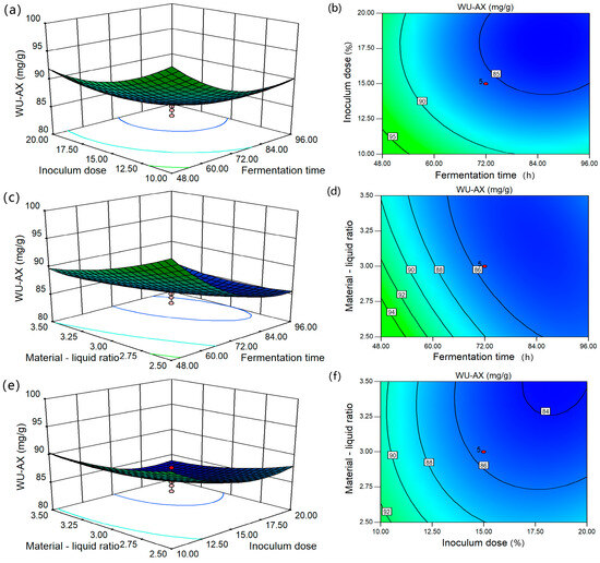 Response-surface plots illustrating the effects on WU-AX content and the interactions between (a) fermentation time and inoculum dose, (c) fermentation time and the material-to-liquid ratio, and (e) inoculum dose and the material-to-liquid ratio. Corresponding 2D contour plots depict the interactions between (b) fermentation time and inoculum dose, (d) fermentation time and the material-to-liquid ratio, and (f) inoculum dose and the material-to-liquid ratio.