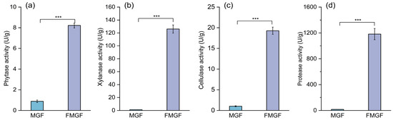 Effects of fermentation on the activities of phytase (a), xylanase (b), cellulase (c), and protease (d). MGF, maize germ feed; FMGF, fermented maize germ feed; *** means significance level of p < 0.001.