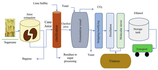 With every industrial process comes highly harmful waste, which, if not properly disposed of, leads to harmful impacts on soil and water sources, and an increase in greenhouse gas emissions, thus polluting the environment. In the sugarcane-alcohol industry, we have vinasse, considered the major contaminant in ethanol production, as it is a severe and recalcitrant product [13,14]. It is a liquid produced in the rectification and distillation unit in the production of bioethanol; the production process is shown in Figure 2.