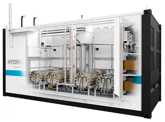 Next, this motor/generator set will be connected to an electrolyzer to assess the production of biohydrogen. The chosen model is the HySTAT 600 from Hydrogenics (Oevel, Belgium) [27], shown in Figure 4.