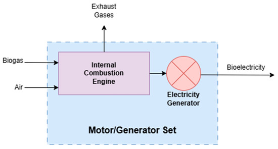 A set involving an internal combustion engine operating with vinasse biogas and an electricity generator is used, in which the production of bioelectricity will be studied. The chosen model is the CG260-16 from Caterpillar (Irving, TX, USA) [26], shown in Figure 3.