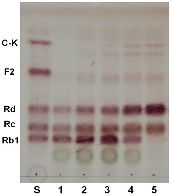 The time profile biotransformation of ginsenoside by Levilactobacillus brevis THK-D437 using a TLC analysis. (S) standard ginsenoside; (1) saponin mixture control (Rb1, Rb2 and Rd); (2) 5 days culture; (3) 10 days culture; (4) 15 days culture; (5) 20 days culture. Abbreviations: (C-K) compound K.