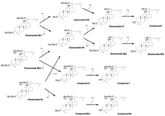 The biotransformation pathway of ginsenoside Rb1, Rb2, and Rc to low-molecular ginsenosides.
