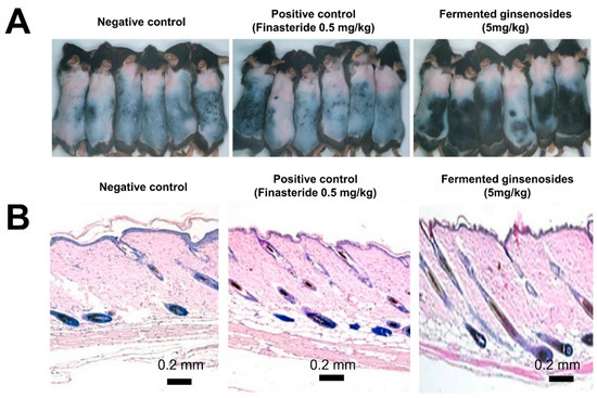 Six-week-old C57BL/6 male mice (Dae-Han Biolink, Seoul, Korea) were allowed to adapt to their new environment for 1 week, with food and water being provided ad libitum. C57BL/6 shaved the hair of 7-week-old mice in telogen, who were divided into groups, including 10 mice who had their hair cut short using animal clippers, and the hair cycle of the mice was then synchronized by chemical depilation via hair removal cream (Veet, Massy, France). Starting the following day, 100 μL of fermented ginsenosides (1 mg/mL in 70% ethanol) were applied topically every day for 18 days. Hair growth rates were evaluated by observation; the darkening pigmentation of the back skin color indicated a telogen to anagen conversion.
