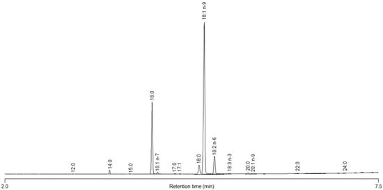 Gas-chromatogram of P. moriformis fatty acid methyl esters in the base strain.