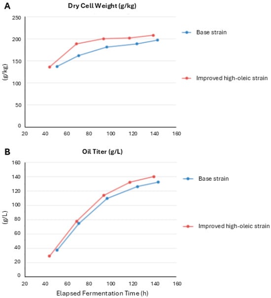 Comparison plots showing dry cell weight (DCW) (A) and volumetric oil production (B) for the base strain versus the classically improved high oleic strain 1 L scale.
