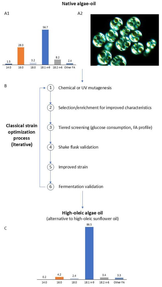 Fatty acid profile (A1) and cell morphology at the end of fermentation (A2) of native P. moriformis isolate used to produce high oleic acid algae oil (C) by a classical strain optimization strategy (B).