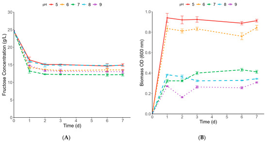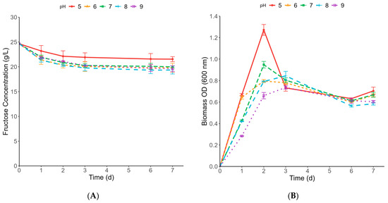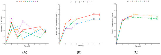 Figure 1B and Figure 2B show biomass OD for both C. ljungdahlii and C. aceticum, respectively. In general, a more acidic pH promotes strain growth [26,27]. In the case of C. ljungdahlii (Figure 1B), this action is observed at pH 5, where biomass OD reaches a value of around 0.95 after 1 d. In the same way, for C. aceticum (Figure 2B), pH 5 consistently exhibited superior growth performance for up to 2 days (~1.3). Beyond that point, all pH conditions showed a similar biomass OD of approximately 0.6, with no significant differences observed. A comparison of the biomass OD in C. aceticum with that of C. ljungdahlii reveals that C. ljungdahlii exhibits more excellent stability over time and achieves enhanced results at acidic pH ranges (5–6), attaining a biomass OD exceeding 0.8. However, their biomass OD performance at alkaline pH levels is not as remarkable, with values not exceeding 0.4. This observation might suggest that C. aceticum has a wider pH adaptability than C. ljungdahlii. Nevertheless, this adaptability also depends on the final products obtained.