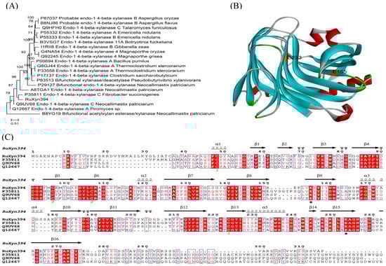 The phylogenetic tree (A), homology modeling (B), and multialignment analysis (C) of RuXyn394. (A) The phylogenetic tree was constructed using the neighbor-joining method. The RuXyn394 was aligned online (https://www.ebi.ac.uk/services) using the UniProtkB/Swiss-Prot database. The first 20 similar sequences obtained were selected to construct the phylogenetic tree by MEGA X software. (B) The homology modeling of RuXyn394 was performed using GH11 xylanase from N. patriciarum (PDB number 3WP6) as the template. Red indicated alpha helices, light blue indicated beta-sheets, gray indicated disordered coils, and E253 and E155 were putative catalytic residues. (C) Multiple alignments of RuXyn394 and several GH11 xylanases from N. patriciarum (UniProtKB accession Q9UV68), Piromyces sp. (UniProtKB accession Q12667), and Fibrobacter succinogenes (UniProtKB accession P35811) were performed using ClustalW. Putative catalytic residues (pentacle).