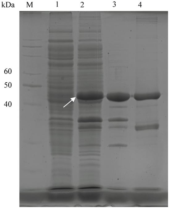 The gene encoding RuXyn394 was expressed in a heterologous host, E. coli BL21 (DE3). SDS-PAGE analysis of the purified protein revealed a distinct band corresponding to approximately 44 kDa, aligning with the calculated theoretical molecular mass of RuXyn394 based on its amino acid sequence (Figure 2).