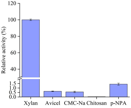 RuXyn394’s substrate specificity was assessed with xylan, Avicel, CMC-Na, chitosan, and p-NPA. The enzyme showed a marked preference for xylan degradation, with notable activity against p-NPA, Avicel, and CMC-Na, while its activity on chitosan was negligible (Figure 3). Subsequently, this study investigated the characteristics of RuXyn394 using xylan, Avicel, CMC-Na, and p-NPA as substrates.