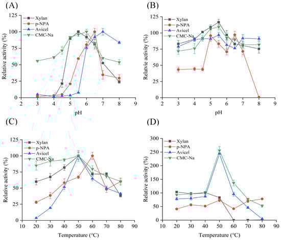 Analysis of RuXyn394’s pH dependency (A) and stability (B), as well as its temperature dependency (C) and stability (D). Substrate concentration was 1% (w/v) wheat straw xylan, 0.0725% p-NPA, 1% CMC-Na, or 1% Avicel. (A) Reactions were carried out in 0.05 M citric acid-disodium hydrogen phosphate buffer system spanning pH 3.0 to 8.0 at 50 °C. (B) Reactions were carried out in their respective optimal pH, varying between 20 and 80 °C. Activity related to pH and temperature variations was presented as relative activity, capped at maximum of 100%. RuXyn394’s resistance to heat (C) and pH (D) was assessed by subjecting it to pre-incubation at 20–80 °C for 1 h, and at pH 3.0–8.0 for 2 h at 4 °C, respectively, after which its remaining activity was measured at optimal pH and temperature.