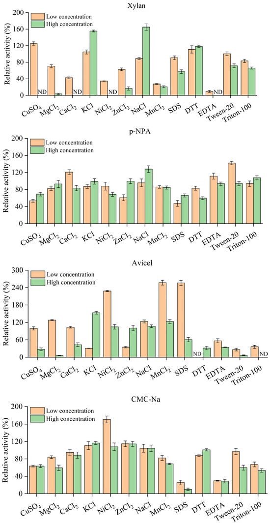 The effects of various metal ions, inhibitors, and detergents on RuXyn394 activity are summarized in Figure 5. When xylan was employed as the detection substrate, Mg2+, Ca2+, Ni2+, Zn2+, and Mn2+ exhibited notable inhibitory effects on RuXyn394 activity at both 1 mM and 5 mM concentrations. Conversely, Cu2+ at 1 mM, K+ at 5 mM, and Na+ at 5 mM enhance RuXyn394 activity by 25%, 55%, and 65%, respectively. SDS and Triton-X100 exhibit a modest inhibitory effect (<50%) on RuXyn, whereas EDTA demonstrates pronounced inhibition, nearly abolishing RuXyn activity even at a concentration as low as 1 mM. The addition of 1 mM and 5 mM DTT resulted in an approximately 11% increase in the RuXyn activity. When utilizing p-NPA as a substrate, the activity of RuXyn increased by 21%, 28%, 11%, and 42% respectively in the presence of 1 mM Ca2+, 5 mM Na+, 1 mM EDTA, and 1 mM Tween20. Other additives exhibited either no significant effect or varying degrees of inhibitory effects on RuXyn activity at two concentrations. When utilizing Avicel as a substrate, at 1 mM, Mg2+, Na+, Ni2+, Mn2+, and SDS enhanced the activity of RuXyn394 by 28%, 128%, 23%, 157%, and 156%, respectively, yet this enhancement markedly diminished, with Mg2+ even exhibiting strong inhibition as concentrations rose to 5 mM. Additionally, 1 mM K+ inhibited RuXyn394 activity by 70%, while 5 mM K+ increased its activity by 53%. DTT, EDTA, Tween-20, and Triton X100 all demonstrated significant inhibitory effects on RuXyn394 regardless of the concentration tested. When utilizing CMC-Na as a substrate, 1 mM and 5 mM K+ and Zn2+ increased RuXyn activity by 10–16%, while 1 mM Ni2+ significantly boosted activity by 70%. Other ions, inhibitors, and detergents showed either negligible impact or different levels of inhibition on RuXyn.