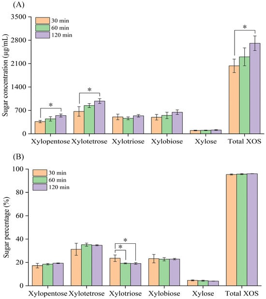 Effects of RuXyn394 on production (A) and percentage (B) of XOS with incubation times of 30, 60, and 120 min. Within same metrics, asterisk indicates significant differences (p ≤ 0.05).