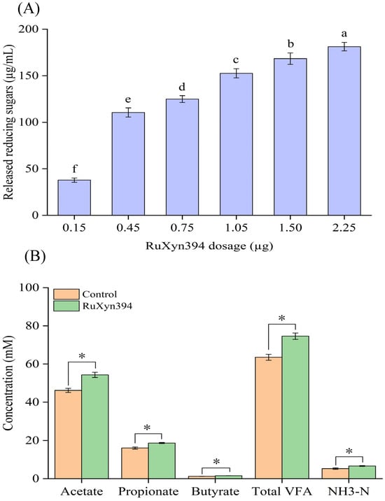 Effects of RuXyn394 on hydrolysis (A) and in vitro microbial fermentation (B) of wheat straw. Significant differences (p ≤ 0.05) are indicated by different lowercase letters and asterisks.