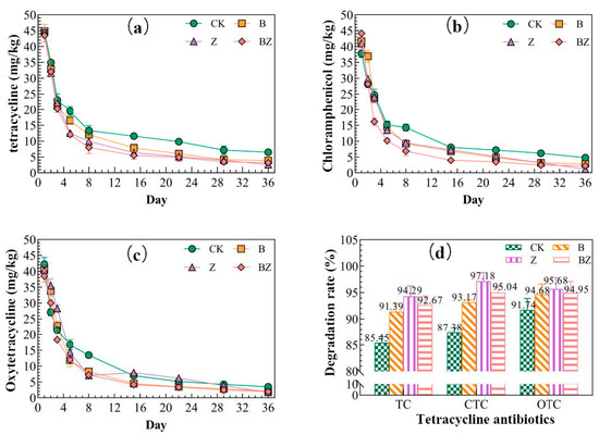 - Conditioners can affect the removal of tetracycline antibiotics during composting by affecting the physicochemical properties and microbial community structure. TC, CTC, and OTC showed the highest degradation rates in group Z, which were 94.29%, 97.18%, and 95.68%, respectively. Among the three TCs, TC has a lower degradation rate in general than that of CTC and OTC.