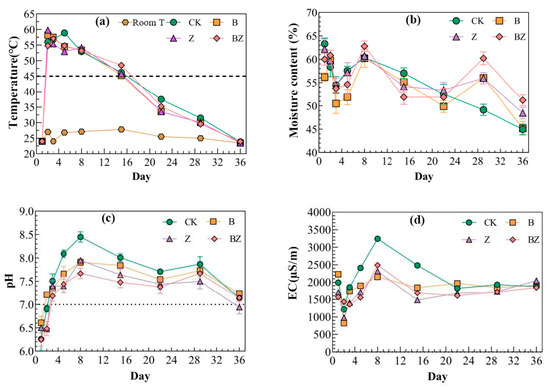 The conductivity is mainly affected by the concentration of organic acid salts and inorganic salts, which could to some extent reflect the plant toxicity of fertilizers [52]. As shown in Figure 2d, there is a small difference in the initial conductivity among each group of compost. All the treated electrical conductivity (EC) showed a brief decrease at the beginning of the composting process and then increased. The EC of the CK group was higher than that of the other three groups during the composting process, indicating that biochar and zeolite, as conditioning agents, slowed down the changes in EC during the composting process. The final conductivity of the four compost groups was less than 9000 µS/m, indicating that the four compost groups had no growth inhibitory effect on plants [53].