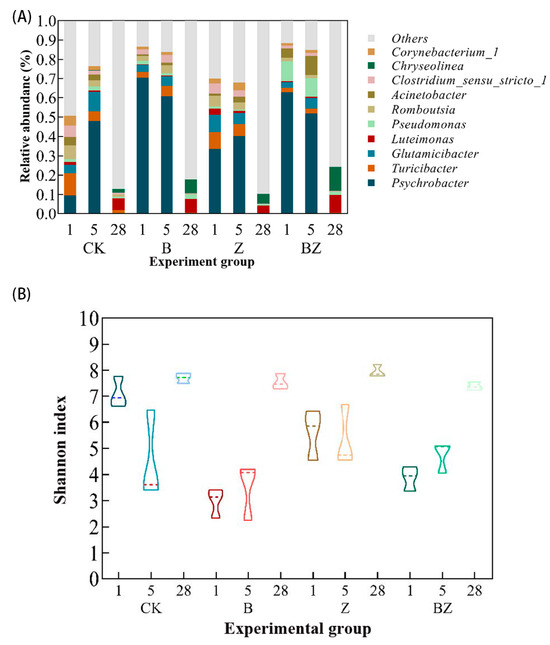 Changes in bacterial genus level (A) and Shannon index (B) of antibiotic heap under different conditioning agents.