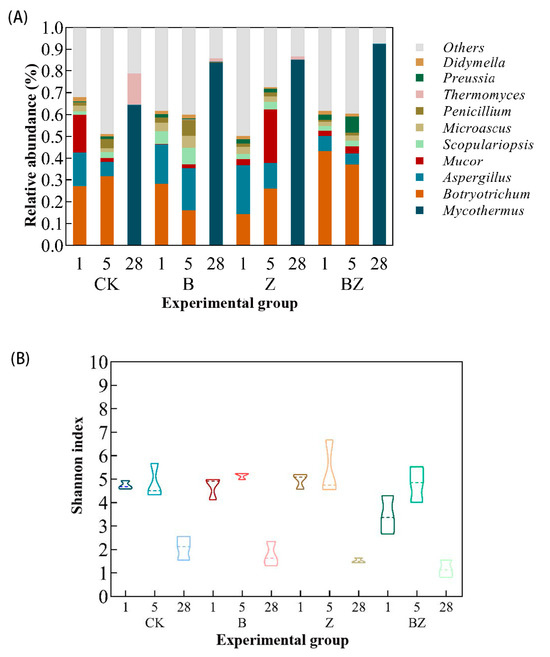 Fungi also play a crucial role, as they can degrade recalcitrant compounds, stabilize organic matter, and decompose organic residues under dry, acidic, and low nitrogen conditions [58]. During the composting process, as shown in Figure 4, at the genus level, the composting process significantly reduced the relative abundance of Botryotrichum, Aspergillus, Mucor, Scopulariopsis, Microascus, and Penicillium, making Mycothermus a dominant bacterial species. Among them, the abundance of Mucor, Scopulariopsis, and Penicillium increased during the high-temperature period, and Microascus in Group B also showed an upward trend during the high-temperature period. Mycothermus can grow above 50 °C. Wang [59] found that Mycothermus is the dominant bacterial group in the aerobic fermentation cooling and maturation stages of cow manure. It can provide energy for the later stage of composting by producing various hydrolytic enzymes to decompose the remaining macromolecular substances after the high-temperature stage [60]. It can be inferred from the changes in the Shannon index during the four composting processes that the richness of fungi in the initial and high-temperature stages of the four composting groups is similar. The addition of conditioning agents B and Z did not significantly affect the richness of fungi in the pile. Although the richness of the BZ group was lower than the other three groups, there was a significant increase in fungal richness during the high-temperature period. Ultimately, composting reduced the richness of fungi in the heap.