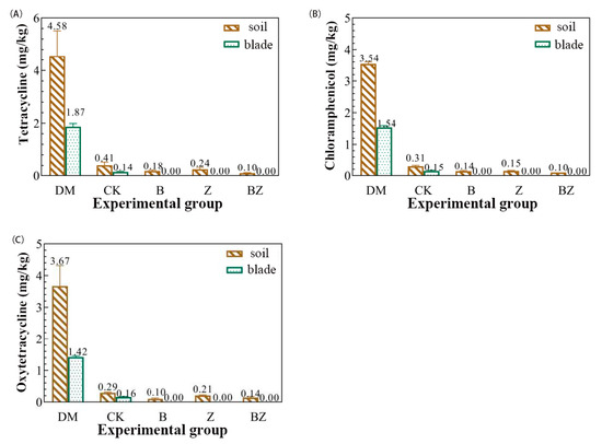 The cultivation experiment of Chinese cabbage was conducted using mature compost as an additive, and the results are shown in Figure 7. In the DM group, the concentration of TCs in the soil is higher than that in the leaves. The soil concentration range was 3.54–4.58 mg/kg, and the leaf concentration range was 1.42–1.87 mg/kg. The concentrations of TCs in the soil and Chinese cabbage treated with composting in groups B, Z, and BZ with the addition of conditioning agents were lower than those in the CK group. Among them, no residual TCs were detected in the leaves treated with groups B, Z, and BZ. The maximum reduction in TC residue in the soil was 75.61% (TC concentration in BZ group soil). Composting with a mixed conditioner of biochar and zeolite had the best effect on reducing the transfer of TCs into the soil and plants.