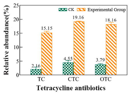 The deer industry in China is constantly developing and growing. With a population of over 55 million sika deer currently being raised, China is one of the world’s major countries for raising and consuming deer products [1]. Favorable policies and a prosperous market have facilitated the large-scale intensive breeding of Chinese sika deer. With the increase in the number of deer raised, more and more anthelmintics (mainly antibiotics) and antibacterial agents are being used to treat animal diseases. Tetracycline antibiotics (TCs) are one of the most commonly used antibiotics in animal husbandry. Due to the high water solubility of most antibiotics, up to 90% of the administered dose can be excreted in urine, and as much as 75% can be eliminated through animal feces. The inadequate biodegradation of these excretions results in an accumulation of antibiotic residues in the soil, potentially harming the environment [2,3,4]. The results of a nationwide assessment of fecal antibiotics in animals in China revealed that animals exhibited the highest concentrations of TCs. Among the 42 antibiotics evaluated, oxytetracycline (OTC), tetracycline (TC), and chlortetracycline (CTC) ranked as the top three [5]. Yang et al. [6] found high concentrations of residual TCs such as TC, OTC, and CTC in both Chinese organic fertilizer raw materials and commercial organic fertilizers. In addition, long-term low-dose TC can have adverse effects on the organisms exposed to it in the environment, including endocrine disorders, chronic toxicity, and antibiotic resistance [7]. These residues are released into agricultural soil after the application of livestock manure and can be subsequently transported to surface- and groundwater [8,9]. This can affect the structure and function of natural microbial communities, and may contribute to the spread of antibiotic-resistant bacteria (ARB) and antibiotic-resistant genes (ARGs) [10,11].