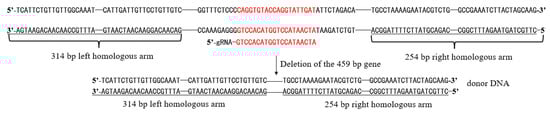 Design of HOM2 donor DNA (Figure 1): The genome of S. cerevisiae (S288c) was used as a template, and two homology arms upstream and downstream of the HOM2 target sequence were amplified by PCR (3 min at 98 °C, and then 35 cycles of 98 °C for 10 s, 55 °C for 15 s, 72 °C for 5 s, followed by a final step at 72 °C for 1 min) with primers HT-F1/HT-R1 and HT-F2/HT-R2, respectively (20 bp of homology was set at the 5′ end of primers HT-R1 and HT-F2). The two segments were then ligated by overlap extension PCR (3 min at 98 °C, and then 28 cycles of 98 °C for 10 s, 55 °C for 15 s, 72 °C for 2 min, followed by a final step at 72 °C for 4 min) to obtain donor DNA.