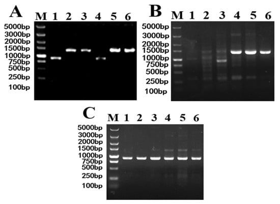 Construction results of recombinant yeast strains. Lane M shows the 5000 bp marker. (A) Verification results for XF0-L: Lanes 2, 3, 5, and 6 are XF0-L; Lanes 1 and 4 are XF0-LH; (B) verification results for XF0: Lanes 1, 2, 4–6 correspond to XF0; Lane 3 corresponds to XF0-h; (C) verification results for XF0-h: Lanes 4–6 correspond to XF0-h; Lanes 1–3 correspond to XF0-H.