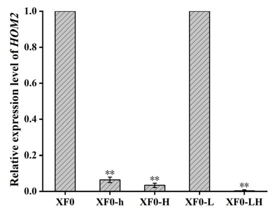 To further validate the expression of the HOM2 gene after knockout, total RNA was extracted from XF0, XF0-h, XF0-H, XF0-L, and XF0-LH, and reverse transcription was performed for cDNA. Then, Real-Time Quantitative PCR was conducted using the cDNA as the template to analyze HOM2 gene expression, as shown in Figure 4. The results indicate that the HOM2 gene expression levels in the XF0-H and XF0-LH are extremely low, confirming the successful knockout of the HOM2 gene. In the case of the XF0-h with one HOM2 allele knocked out, the HOM2 gene expression level is only 6% of the XF0.