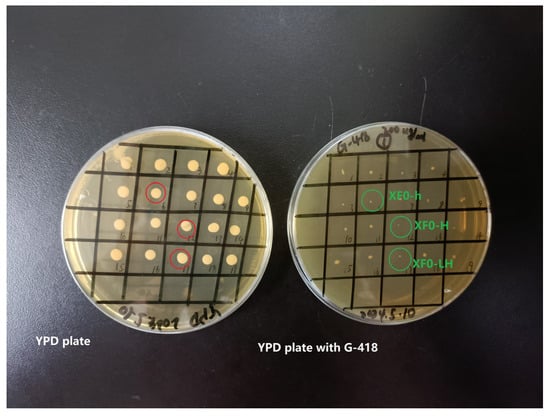 The gene knockout strains were cultured in 25 mL of YPD broth at 30 °C for 24 h. Then, they were subcultured for over 12 generations. Recombinant yeasts, XF0-h, XF0-H, and XF0-LH, which had lost the plasmid and exhibited no resistance, were selected in YPD medium with 200 μg/mL G418.