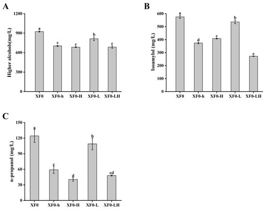 Figure 6A illustrates that the higher alcohol content in the fermentation broth of XF0-h (704 ± 8 mg/L) and XF0-H (685 ± 6 mg/L) was reduced by 23.93% and 25.98%, respectively, compared to XF0 (925 ± 9 mg/L). The higher alcohol content in the fermentation broth of XF0-LH (685 ± 19 mg/L) was reduced by 15.81% compared to XF0-L (814 ± 29 mg/L). This indicates that the deletion of the HOM2 gene can decrease the higher alcohol content.