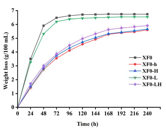 Fermentation was conducted with the XF0, XF0-L, XF0-h, XF0-H, and XF0-LH strains. The weight loss was recorded every 24 h to generate cumulative weight loss curves. The results are shown in Figure 7.