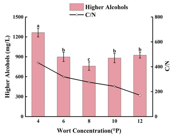 Effect of wort concentration on higher alcohols (XF0-LH, 27 °C, 5 days). The analysis of variance (ANOVA) is used to evaluate the significant differences among the values (p < 0.05). Values with different letters in the same bar are significantly different (p < 0.05).