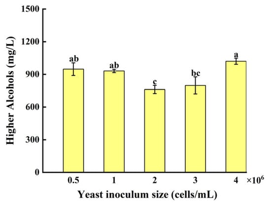 Effect of XF0-LH inoculum size on higher alcohols (8 °P wort, 27 °C, 5 days). The analysis of variance (ANOVA) is used to evaluate the significant differences among the values (p < 0.05). Values with different letters in same bar are significantly different (p < 0.05).