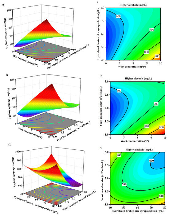 Response surface and contour plots for the content of higher alcohols (mg/L). (A,a) Effect of wort concentration and hydrolyzed broken rice syrup addition; (B,b) effect of wort concentration and inoculum size of XF0-LH; (C,c) effect of hydrolyzed broken rice syrup addition and inoculum size of XF0-LH.