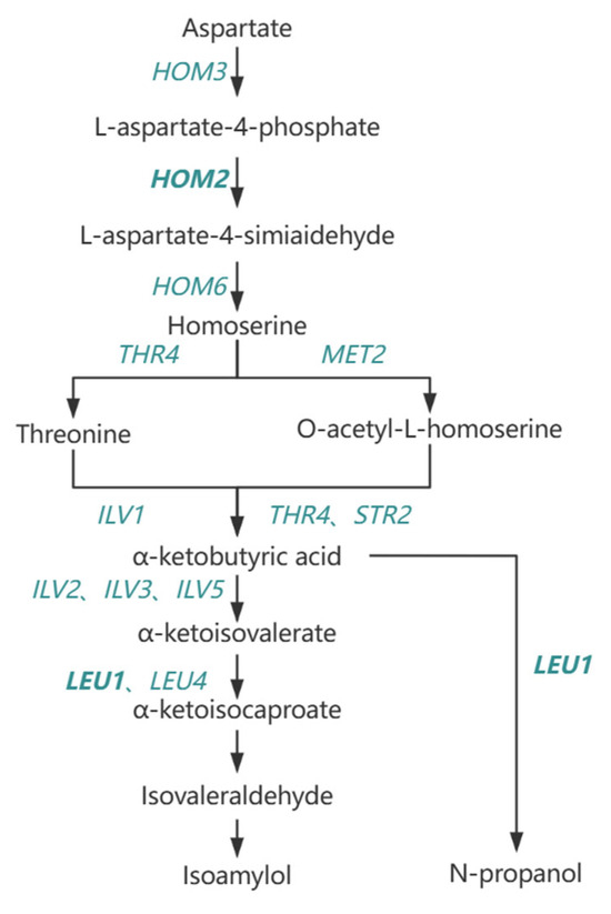 The higher alcohols produced by yeast during alcohol fermentation play an important role in the taste of whiskey. The HOM2 gene plays a key role in the metabolism of higher alcohols in yeast. Therefore, genetic analysis of the HOM2 gene is important for controlling the content of higher alcohols in whiskey. It shows that HOM2 knockout strains can reduce the content of n-propanol, isoamylol and higher alcohols in whiskey, which is consistent with previous reports [37]. This is due to the HOM2 knockout, which reduces the expression of aspartate β-semialdehyde dehydrogenase, which further reduces the generation of α-ketobutyric acid from aspartylphosphate, resulting in the reduced production of n-propanol and isoamylol (Figure 11) [38,39]. Isoamylol in the fermentation broths of HOM2 and LEU1 knockout strains was significantly lower than that of the HOM2 knockout strains. This is because LEU1 knockout resulted in reduced production of α-ketoglutarate to produce α-ketohexanoic acid, which in turn reduced isoamylol production.