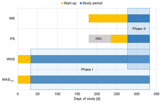 Semi-continuous digestion experiments were performed on a laboratory scale using four digesters with a working volume of 16 L each. The reactors were operated in a climate chamber at 37 °C with intermittent mixing by an overhead stirrer (15 min run time, 15 min pause). Digested sludge from the full-scale digester of the investigated WWTP was used as inoculum. The laboratory digesters were fed with PS and WAS from the full-scale WWTP, as well as thermally hydrolyzed WAS (WASTH) and MS. MS was produced manually as a mixture of PS and WAS. Each sludge was fed to the reactors over feeding periods of 11 d to 33 d. Feeding was carried out between 5 and 7days per week. The reactors were operated at a calculative SRTAD of 18 to 20 d. For proper manual feeding over each period, feed samples were frozen batch-wise at −18 to −24 °C and thawed at room temperature one day before usage. Storage had no relevant effect on the sludge properties and, thus, negligible effects on the digestion experiments. The performance of the digesters was evaluated for each feeding period. Only consecutive days without operational disturbances (e.g., malfunction of the gas volume measurement) were considered. For this reason, the evaluation period is, in some cases, shorter than the feeding period. As shown in Figure 1, the experiments are grouped into two phases to distinguish two research objectives. The relevant data for both phases and for each evaluation period are summarized in Table A1.