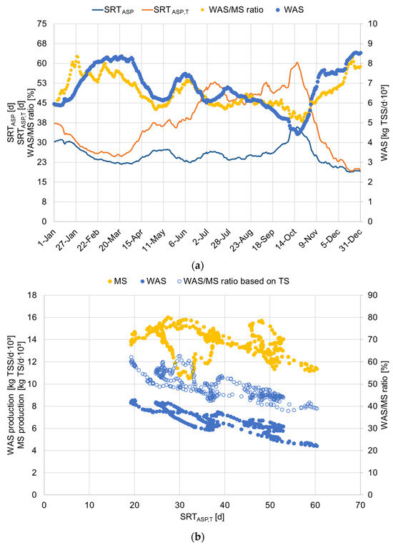 Sludge production and operating conditions of the ASP of the full-scale WWTP: (a) course of SRTASP, SRTASP,T, WAS production, and WAS/MS ratio within one year and (b) WAS production, MS production, and WAS/MS ratio plotted against SRTASP,T.