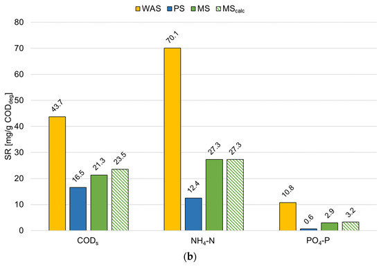 The SMY of PS was more than twice as high as the SMY of WAS (Figure 4a). WAS consists of a complex matrix of microbial and exopolymeric substances, making the sludge more difficult to degrade than PS. The different composition also affected the specific release of CODs, NH4-N, and PO4-P, which was significantly lower for PS than for WAS (Figure 4b). The rationale is that the degradation of proteins, for example, leads to the release of NH4-N. PS consists of a higher proportion of carbohydrates and lipids and a lower proportion of proteins than WAS [41,42], and consequently, the release of NH4-N is significantly lower in PS.