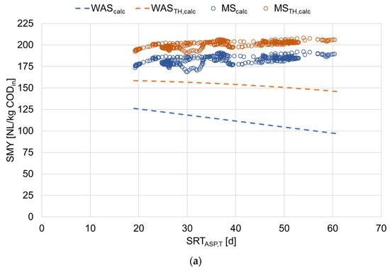 The further the WAS is aerobically stabilized in the ASP, the lower its SMY. Accordingly, the SMY of WAS decreased with increasing SRTASP,T. It was expected that a similar, albeit weaker, trend would result for the SMY of MScalc. However, as Figure 5a shows, an influence of SRTASP,T on the SMY of MScalc could not be identified. The reason for this is that, in addition to the SMY of WAS, the amount of WAS and, thus, the WAS/MS ratio, decreased with increasing SRTASP,T for the investigated WWTP. In combination with the high SMY of the PS, this resulted in a balancing effect. An influence of SRTASP,T existed, but could not be shown on the basis of the SMY of MScalc. The influence of SRTASP,T was also not identifiable when analyzing the SMY of MSTH,calc, which was expected when looking at the course of the SMY of WASTH,calc.