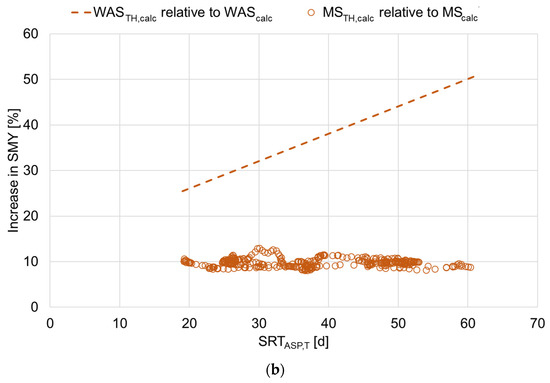The proportion of WASTH,calc increased the SMY for MSTH,calc relative to MScalc in the range from 8.1% to 13.0% and, on average, by 9.8% ± 0.9% (Figure 5b). The increase in SMY for WASTH,calc relative to WAScalc was more than two-to-five times higher than the increase for MSTH,calc. SRTASP,T had a decisive influence on the efficacy of thermal hydrolysis in increasing the SMY of WAScalc relative to WAScalc: The higher the SRTASP,T, the higher the relative increase in SMY [29]. This relationship can be explained by increasing proportions of non-biodegradable or slowly degradable compounds at higher SRTASP,T, which are made more bioavailable by thermal hydrolysis [17,18]. The influence of SRTASP,T was also present when considering the increase in SMY of MScalc vs. MSTH,calc, but could not be shown in the results of Figure 5b, due to the balancing effect described above.