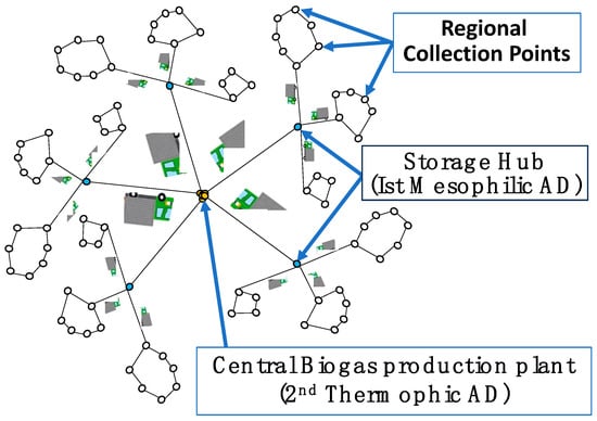 Schematic representation of treatment system of food waste by TSMATD based on the “hub-and-spoke” model. The first stage (primary storage) and the second stage of AD (biogas production) correspond to hub and demand nodes, respectively.