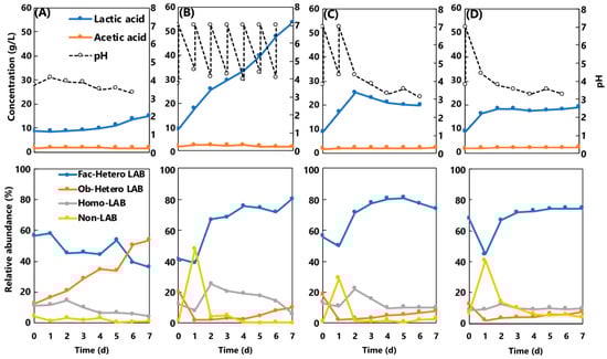 The seed culture initially included Fc-Hetero-LAB (58–66%), Ob-Hetero-LAB (13–18%), Homo-LAB (14–15%), and Non-LAB (4–10%). During batch storage without pH neutralization (Figure 2A), the abundance of Fc-Hetero-LAB gradually decreased to 38%, whereas that of Ob-Hetero-LAB increased by 55% after 7 days. In contrast, in Runs (B)–(D), the occupancy of Fc-Hetero-LAB increased during the initial 2 days and maintained an abundance of 70–80% during incubation. Members belonging to non-LAB remained low, particularly in Run (D). The major OTUs in Fc-Hetero-LAB belonged to the genera Lacticaseiobacillus and Lactiplantibacillus.