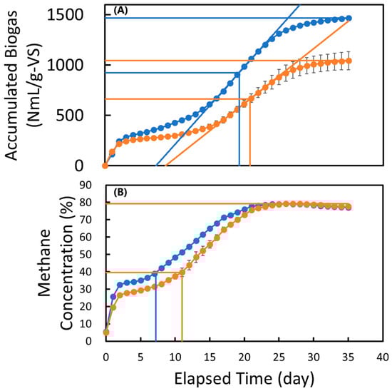 Time course of biogas production on TSMTAD (blue) and SSAD (orange). (A) Accumulated biogas; (B) Methane concentration.