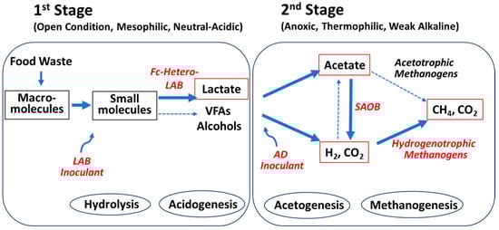 Anaerobic digestion comprises a sequence of microbial degradation processes of complex organic matter under anoxic conditions. During these processes, macromolecules are broken down through a series of microbial transformation steps, including hydrolysis/acidogenesis, acetogenesis, and methanogenesis, to produce methane, carbon dioxide, hydrogen, and ammonia as end products; this is sometimes denoted as methane fermentation []. Anaerobic digestion has received considerable attention due to the fact that carbon and energy can be recovered as methane in biogas fuel, in addition to stabilizing waste and wastewater. On the contrary, the abortive anaerobic digestion of food waste results in the emission of methane, a greenhouse gas, into the atmosphere, which is related to an issue on climate action in SDGs (SDG13). Research on efficient treatment systems has been conducted to improve energy recovery via systems []. In addition, recent analytical advances in microbial community structure and function have enabled a precise understanding of the complex transformation steps in dynamic mixed-culture systems [,]. In particular, the two-stage anaerobic digestion (TSAD) of food waste has been investigated and summarized []. Therein, the microbes at the hydrolysis/acidogenic step fundamentally differ from the subsequent acetogenic and methanogenic microbes in their physiology and environmental conditions []. Thus, separate operation of each stage, including the control of pH and temperature, is an advantage of two-stage AD systems.