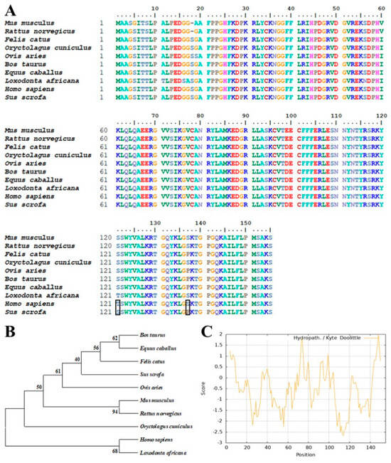 Analysis of bFGF sequences and properties. (A) ClustalW alignment of bFGF amino acid sequences from Homo sapiens and Sus scrofa. Black boxes highlight the differences between the two species. (B) Neighbor-joining phylogenetic tree of 10 bFGF sequences constructed using MEGA 11.0 with 1000 bootstrap replicates. (C) Hydropathicity profile of bFGF (S. scrofa) predicted using the ProtScale tool.