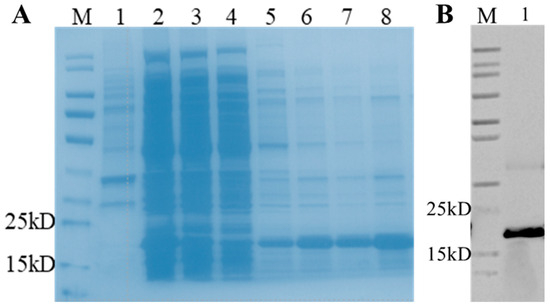 To ensure the successful soluble expression of porcine bFGF protein, the bFGF gene was initially subjected to codon optimization for optimal expression in E. coli. The optimized gene was subsequently ligated into the pET-28a (+) expression vector, resulting in the construction of the pET28-bFGF plasmid. This expression vector was then transformed into E. coli BL21 cells. A single colony of the transformed E. coli BL21 cells, designated as BLETF, was cultivated under standard conditions at 37 °C. Protein expression was induced when the OD600 of the culture reached 0.5 by adding IPTG to a final concentration of 0.5 mM. After 10 h of cultivation, the expression of bFGF was analyzed using SDS-PAGE. Initial results revealed a significant formation of inclusion bodies at 37 °C, necessitating optimization of the expression conditions. To address this issue, the induction temperature was reduced to 25 °C. This modification resulted in successful soluble expression of bFGF in E. coli, as evidenced by SDS-PAGE analysis (Figure 2A). The recombinant porcine bFGF protein, which included a histidine tag for purification purposes, was successfully isolated using nickel-affinity chromatography. The majority of contaminating proteins were eliminated during the flow-through and washing steps, while the target protein, appearing as a distinct band at approximately 18.1 kDa, was eluted using 100 mM imidazole. The resulting product was confirmed to be the porcine bFGF protein through Western blot analysis (Figure 2B). The concentration of the purified recombinant bFGF protein was determined using the bicinchoninic acid (BCA) assay.