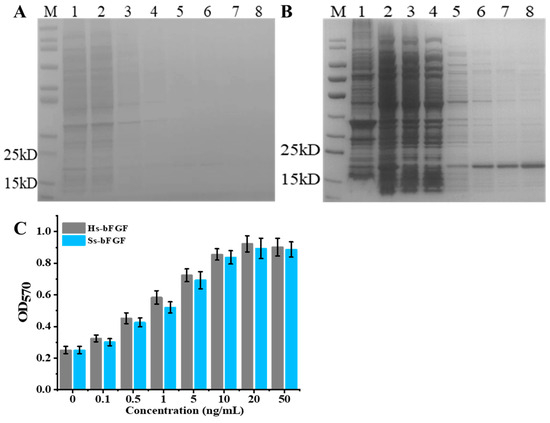 SDS-PAGE analysis of His-tagged bFGF purification from E. coli DHELF cells under (A) dark and (B) blue light illumination conditions. M: Molecular weight marker; Lanes: 1, Precipitate; 2, Supernatant; 3, Flow-through; 4, Wash fraction; 5–8, Elution fractions with increasing imidazole concentrations (5, 20, 50, and 100 mM, respectively). (C) Dose-dependent effect of different bFGF sources on cell viability measured by MTT assay. Hs-bFGF represented commercial human bFGF, while Ss-bFGF indicated blue light-induced porcine bFGF. Cell viability was assessed by measuring the optical density (OD) at 570 nm. bFGF concentrations ranged from 0 to 50 ng/mL.
