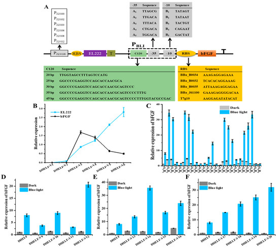 Subsequently, the correlation between the strength of the PBLI promoter and the transcriptional activity of the bFGF gene was investigated [41,49]. To this end, we conducted a comprehensive analysis of the PBLI promoter architecture by systematically modifying the −35 and −10 hexamer sequences, which were critical determinants of promoter strength and specificity. This approach aimed to fine-tune the promoter’s strength and minimize leakiness, ultimately identifying the optimal combination for blue light-induced bFGF expression while minimizing background expression in the absence of blue light stimulation. As presented in Figure 4C, the A3B5 variant of the promoter construct exhibited the lowest level of basal expression, indicative of a successful reduction in leakiness. However, the relative induction in bFGF expression under blue light illumination was modest, at only 8.1-fold. Notably, while the basal expression of the A4B3 group was significantly lower than that of A1B1 (the control PBLI) under dark conditions, a substantial 34.8-fold induction in bFGF expression was observed upon blue light illumination. These results underscored the critical role of PBLI promoter strength, as influenced by the specific combination of −35 and −10 hexamers, in achieving enhanced blue light-induced bFGF expression. Furthermore, we tried to optimize the efficiency of translation initiation by evaluating various ribosome binding sites (RBS) sequences positioned upstream of the bFGF gene [51]. A range of RBS with different predicted strengths was selected and tested to identify the optimal translation initiation rate that effectively balanced protein production with the allocation of cellular resources. As illustrated in Figure 4D, a stronger RBS variant (rbsD) was strategically positioned upstream of the bFGF coding sequence. Upon blue light induction, the strain DHELF-V12, which harbored the optimized RBS (T7g10), demonstrated the highest increase in bFGF protein expression among all tested strains, highlighting the efficacy of this optimization strategy. The result exhibited that the optimization of the PBLI promoter and the RBS sequences not only enhanced the inducibility of the bFGF gene but also ensured that the expression system remained quiescent in the absence of blue light stimulus, thereby minimizing the metabolic burden on the E. coli cell. These findings collectively demonstrated the importance of fine-tuning both transcriptional and translational control elements in maximizing the efficiency of blue light-induced bFGF expression.