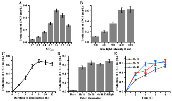 Optimization of bFGF fermentation in the DHELF-Opto strain through modulation of blue light illumination parameters. (A) The optimization of initiate OD600 for blue light illumination initiation. (B) Dose–response relationship between blue light intensity and bFGF production. (C) Effect of blue light illumination duration on bFGF production. (D) Influence of intermediate light pulsing on bFGF production. (E) Temporal dynamics of bFGF accumulation at 2 h intervals under various blue light pulsing regimes.